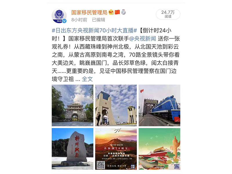 為慶祝新中國成立70周年,中央廣播電視總臺于9月29日至10月1日,在央視新聞各新媒體平臺推出70小時不間斷大型直播活動。我局將此次直播作為展示祖國大美邊關、展示移民管理隊伍優(yōu)良作風、展示我局民警戍邊風采的重要契機,選取西藏總站日喀則珠峰邊境派出所、廣西總站友誼關邊檢站、云南總站瑞麗邊檢站、新疆總站霍爾果斯邊檢站、深圳總站深圳灣邊檢站、內蒙古總站滿洲里邊檢站、黑龍江總站大興安嶺地區(qū)北極邊境派出所、遼寧總站丹東邊檢站等8個單位作為直播地點,組織民警職工認真籌備,在日程、人員、拍攝、保障等方面的安排上做到精準到位、精益求精,確保直播工作順利進行。央視新媒體于9月30日12時至13時黃金時段不間斷直播了我局一線民警堅守崗位、忠誠奉獻的風采,取得了良好的宣傳效果和社會影響。