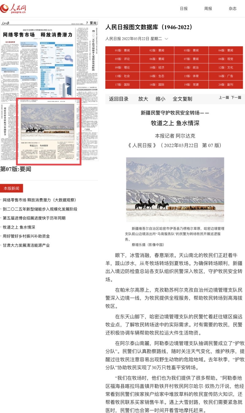 《人民日?qǐng)?bào)》:新疆民警守護(hù)牧民安全轉(zhuǎn)場(chǎng)