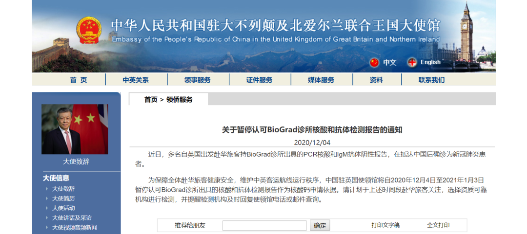 12月4日,中國(guó)駐英國(guó)大使館通過(guò)官方網(wǎng)站發(fā)布《關(guān)于暫停認(rèn)可BioGrad診所核酸和抗體檢測(cè)報(bào)告的通知》,具體內(nèi)容如下: