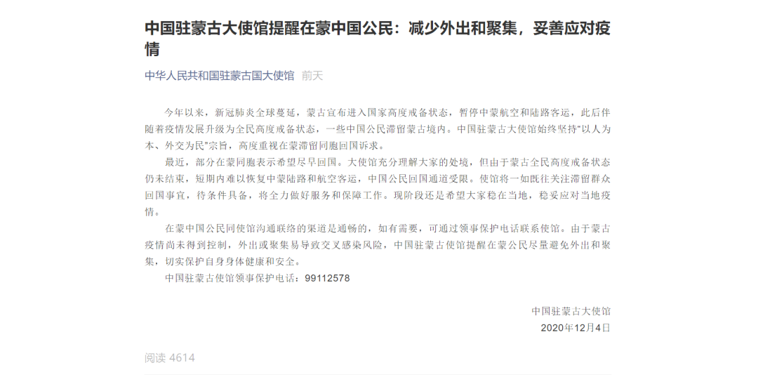 12月4日,中國駐蒙古國大使館通過微信公眾號發(fā)布《中國駐蒙古大使館提醒在蒙中國公民:減少外出和聚集,妥善應(yīng)對疫情》,具體內(nèi)容如下: