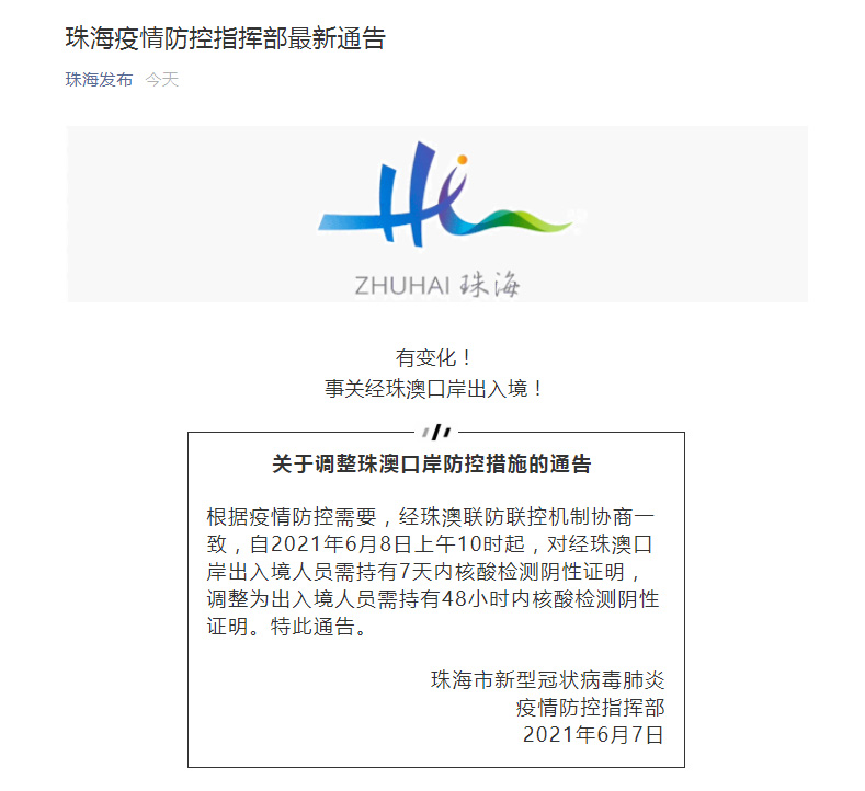 珠海市新型冠狀病毒肺炎疫情防控指揮部6月7日發(fā)布通告稱,根據(jù)疫情防控需要,經(jīng)珠澳聯(lián)防聯(lián)控機制協(xié)商一致,自2021年6月8日上午10時起,對經(jīng)珠澳口岸出入境人員需持有7天內(nèi)核酸檢測陰性證明,調(diào)整為出入境人員需持有48小時內(nèi)核酸檢測陰性證明。