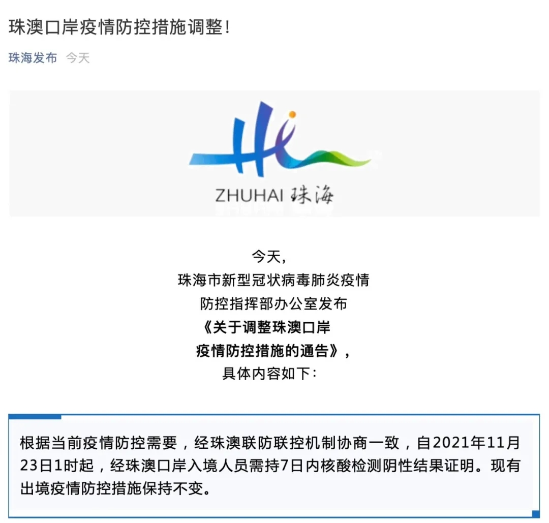珠海市新型冠狀病毒肺炎疫情防控指揮部11月22日發(fā)布通告稱,根據(jù)當(dāng)前疫情防控需要,經(jīng)珠澳聯(lián)防聯(lián)控機(jī)制協(xié)商一致,自2021年11月23日1時(shí)起,經(jīng)珠澳口岸入境人員需持7日內(nèi)核酸檢測陰性結(jié)果證明。現(xiàn)有出境疫情防控措施保持不變。