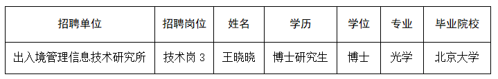 日前,我局出入境管理信息技術(shù)研究所擬聘用人員(5月16日在本平臺公示)中1人自行放棄聘用。根據(jù)事業(yè)單位公開招聘有關(guān)規(guī)定,確定報(bào)考同一崗位的考生王曉曉為擬遞補(bǔ)聘用人員,現(xiàn)予以公示。公示期間,如有問題,請向我單位反映。