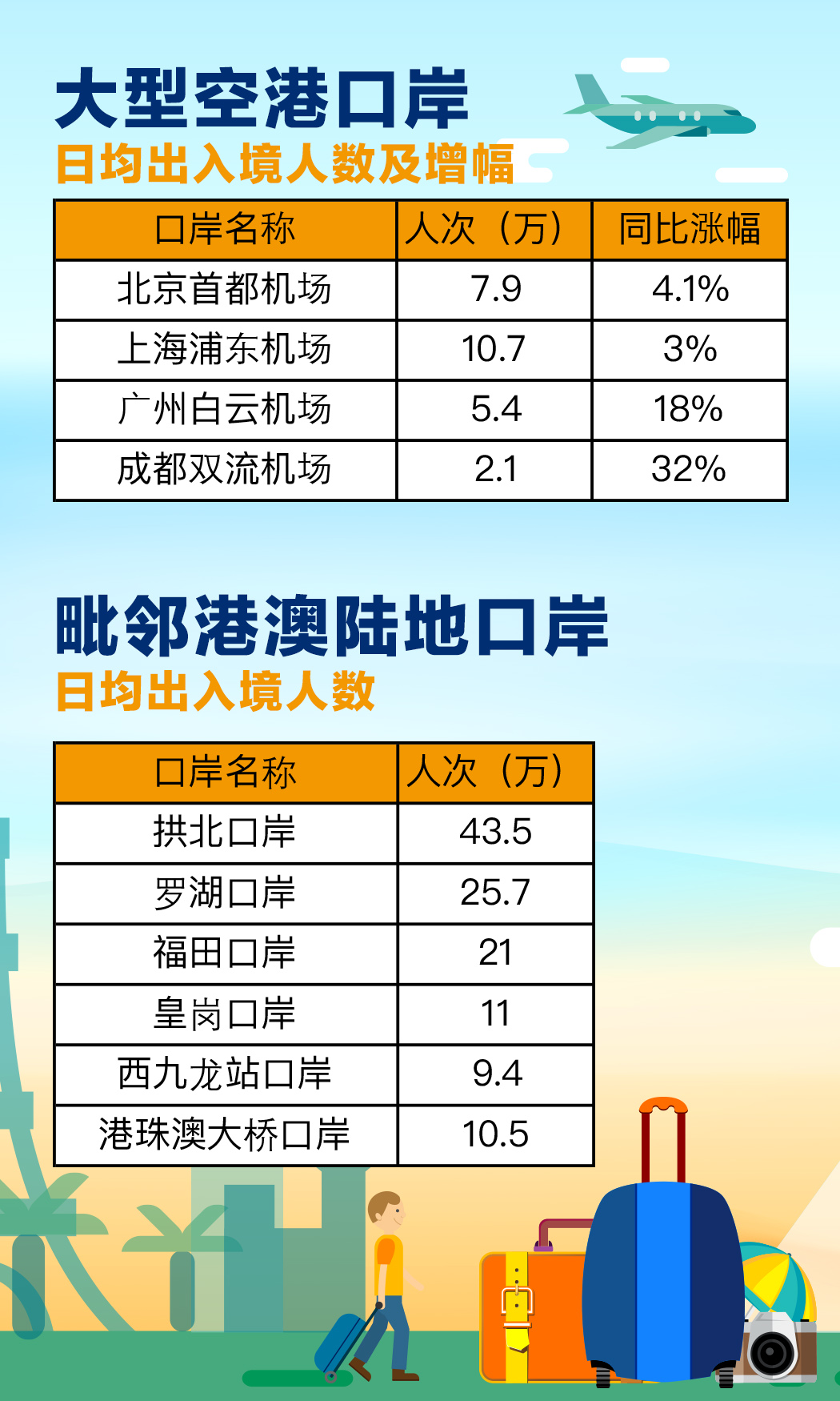 據(jù)國(guó)家移民管理局預(yù)測(cè),2019年“五一”假期全國(guó)口岸將迎來(lái)出入境客流“小高峰”,日均出入境旅客將達(dá)到220萬(wàn)人次,同比增長(zhǎng)5.9%。特別是北京首都機(jī)場(chǎng)、上海浦東機(jī)場(chǎng)、廣州白云機(jī)場(chǎng)、成都雙流機(jī)場(chǎng)等大型空港口岸出入境客流增幅明顯,預(yù)計(jì)日均分別達(dá)到7.9萬(wàn)人次、10.7萬(wàn)人次、5.4萬(wàn)人次、2.1萬(wàn)人次,同比分別增長(zhǎng)4.1%、3%、18%、32%。內(nèi)地居民經(jīng)毗鄰港澳陸地口岸赴港澳旅游將成為出入境客流新的增長(zhǎng)點(diǎn),預(yù)計(jì)拱北口岸日均出入境人數(shù)將達(dá)到43.5萬(wàn)人次、羅湖口岸日均出入境人數(shù)將達(dá)到25.7萬(wàn)人次、福田口岸日均出入境人數(shù)將達(dá)到21萬(wàn)人次、皇崗口岸日均出入境人數(shù)將達(dá)到11萬(wàn)人次、西九龍站口岸日均出入境人數(shù)將達(dá)到9.4萬(wàn)人次、港珠澳大橋口岸日均出入境人數(shù)將達(dá)到10.5萬(wàn)人次。