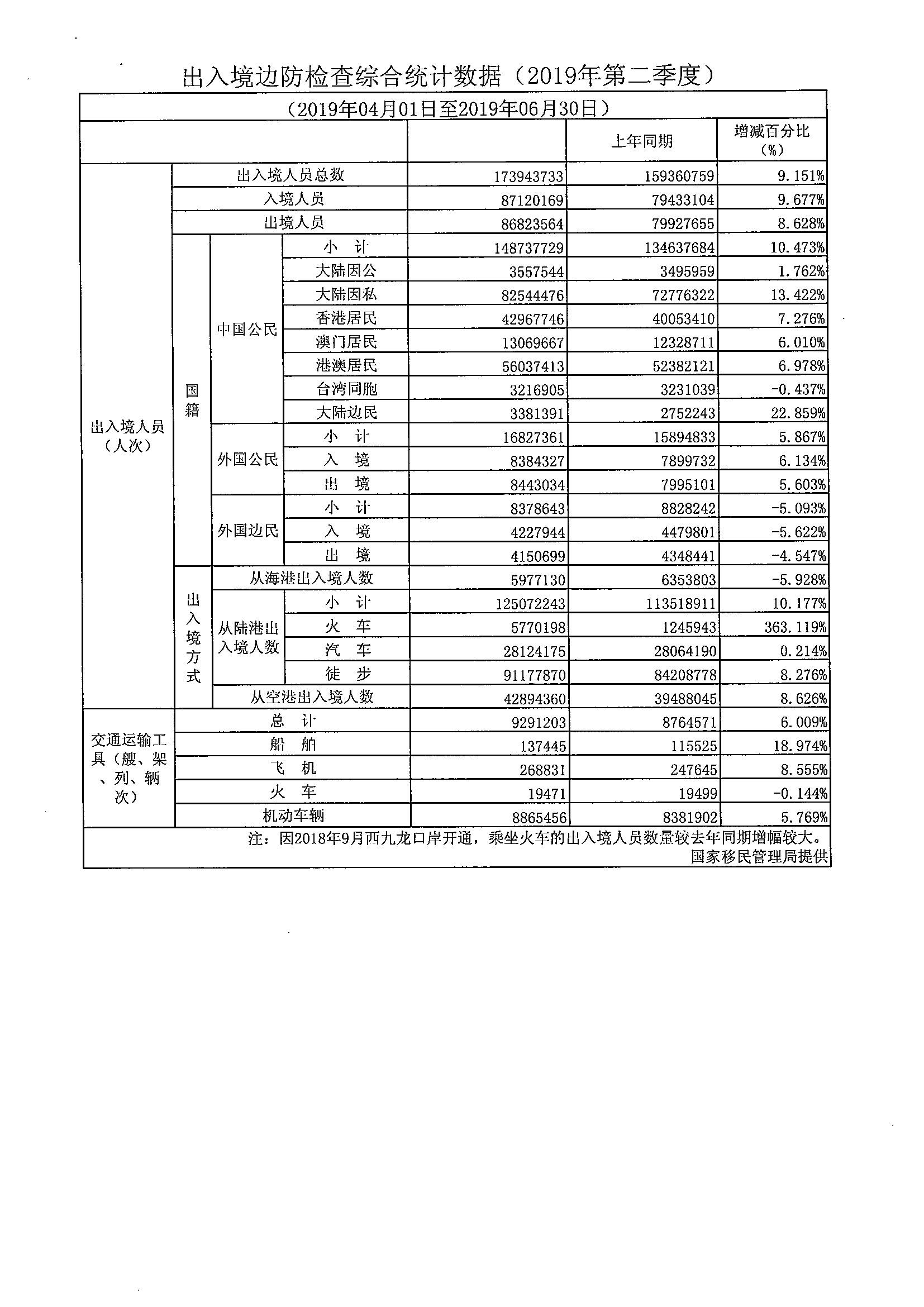 出入境邊防檢查綜合統(tǒng)計(jì)數(shù)據(jù)(2019年第二季度)
