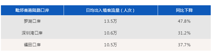毗鄰澳門陸路口岸出入境客流增長較快,拱北口岸日均出入境人員達到44萬人次,同比增長6%。毗鄰香港陸路口岸出入境客流降幅明顯。