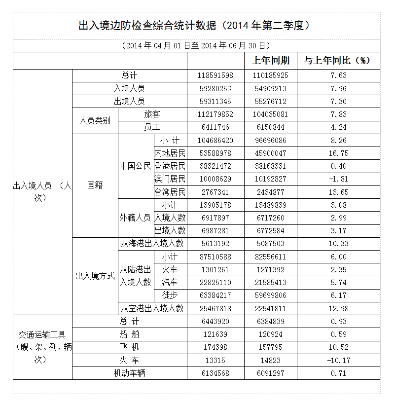 出入境邊防檢查綜合統(tǒng)計數(shù)據(jù)(2014年第二季度)