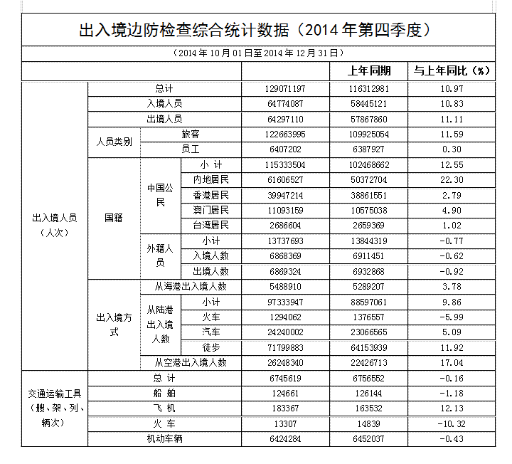 出入境邊防檢查綜合統(tǒng)計數(shù)據(jù)(2014年第四季度)