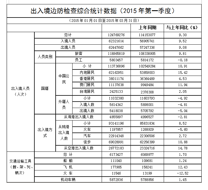 出入境邊防檢查綜合統(tǒng)計(jì)數(shù)據(jù)(2015年第一季度)