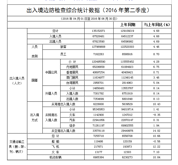 出入境邊防檢查綜合統(tǒng)計(jì)數(shù)據(jù)(2016年第二季度)