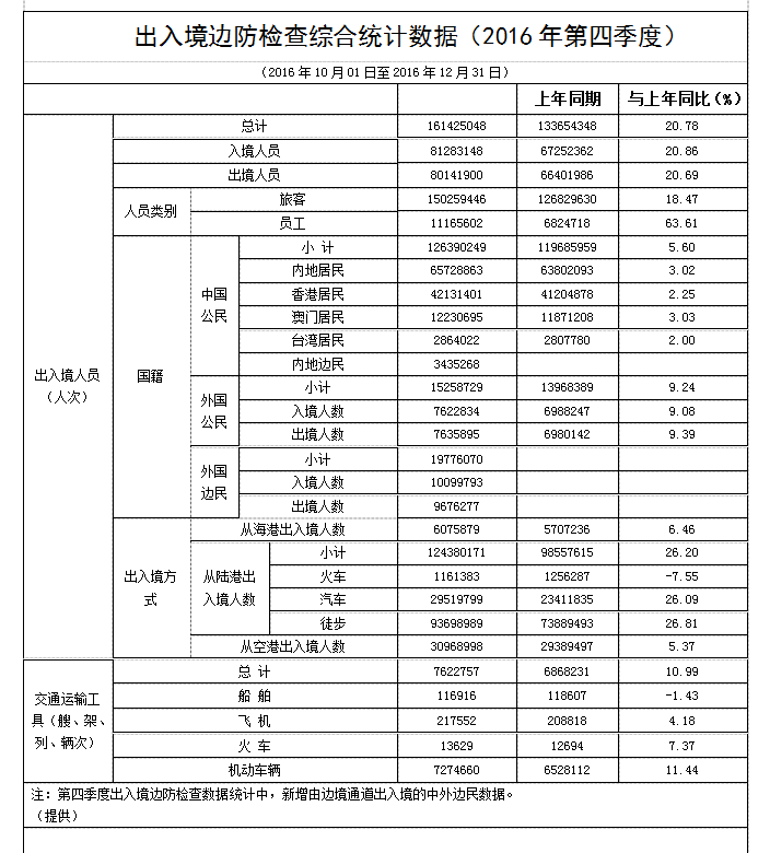 出入境邊防檢查綜合統(tǒng)計(jì)數(shù)據(jù)(2016年第四季度)