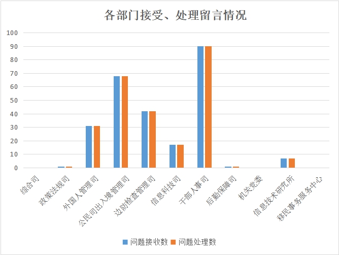 從留言接收回復情況看,各部門均能及時有效答復。截至2019年12月31日,網(wǎng)站留言答復率為100% 。其中,干部人事司、公民出入境管理司、邊防檢查司接收問題數(shù)較多,分別為90條、68條、42條。