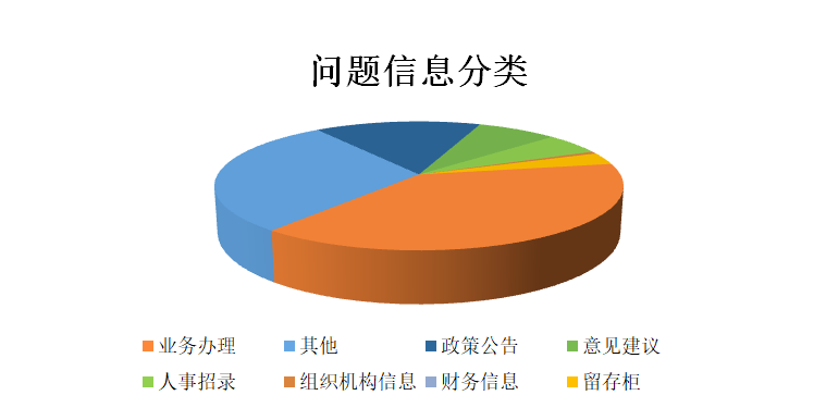 從留言類型看,涉及業(yè)務(wù)業(yè)務(wù)辦理類的留言最多,共計(jì)216條,占比38.64%;其他類留言共計(jì)164條,占比為29.34%;政策公告類留言共計(jì)87條,占比15.56%;意見建議類共計(jì)留言42條,占比為7.51%;人事招錄類共計(jì)留言30條,占比為5.37%;