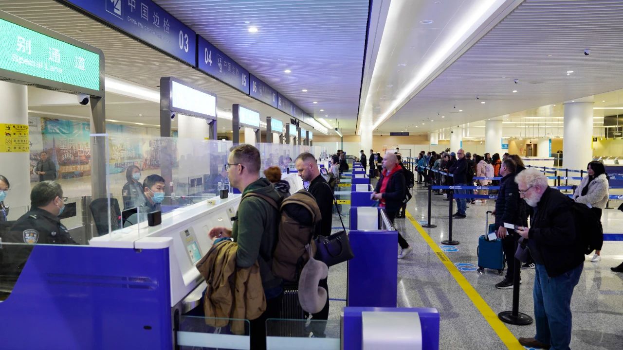 對瑞士等6國試行免簽政策首日,重慶口岸迎來首批免簽入境旅客。(張少波 攝)