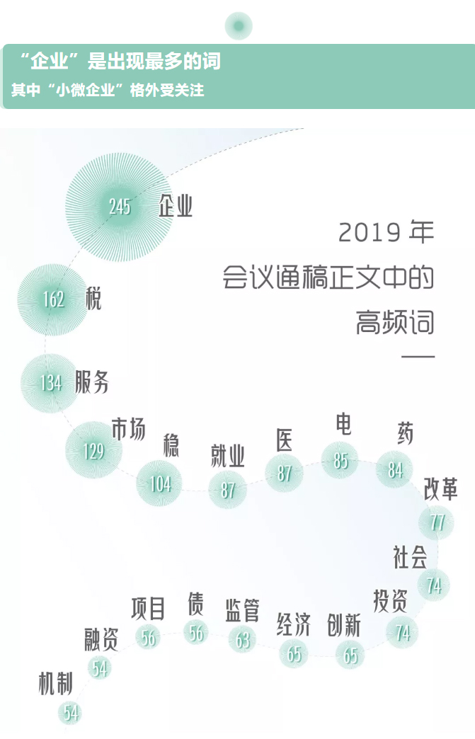 “企業(yè)”是2019年國務(wù)院常務(wù)會第一高頻詞,共被提及245次。從2019年第一次國務(wù)院常務(wù)會決定將企業(yè)簡易注銷時間減少一半開始,對企業(yè)的關(guān)注便貫穿全年。簡化企業(yè)開辦手續(xù)、降低企業(yè)用電成本、清理拖欠企業(yè)賬款……從開業(yè)到經(jīng)營到注銷,涵蓋企業(yè)全生命周期。