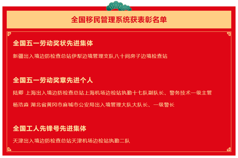 全國(guó)移民管理系統(tǒng)2名個(gè)人2個(gè)集體獲全國(guó)五一勞動(dòng)表彰