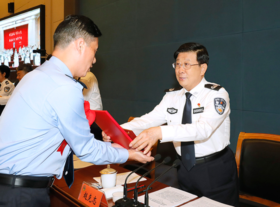 7月27日,全國(guó)公安機(jī)關(guān)慶祝建黨100周年安保維穩(wěn)工作總結(jié)表彰電視電話會(huì)議在京召開(kāi)。圖為國(guó)務(wù)委員、公安部黨委書(shū)記、部長(zhǎng)趙克志為受表彰代表頒獎(jiǎng)。