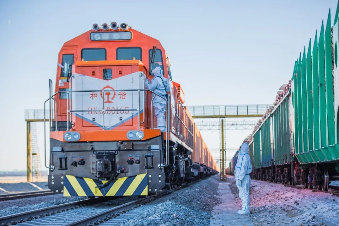圖為內(nèi)蒙古出入境邊防檢查總站二連邊檢站移民管理警察正在查驗中歐班列。(郭鵬杰 攝)