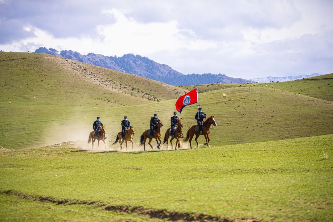 圖為新疆出入境邊防檢查總站伊犁邊境管理支隊移民管理警察在邊境一線巡邏踏查。(王帥 攝)
