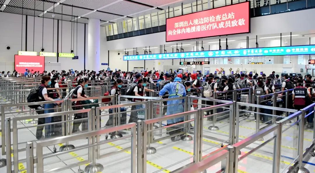 圖為深圳出入境邊防檢查總站蓮塘邊檢站移民管理警察全力保障內(nèi)地援港醫(yī)療隊快速通關(guān)。(馬唯彬 攝)