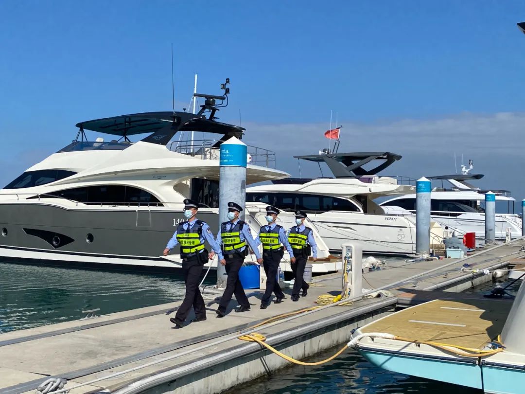 圖為??诔鋈刖尺叿罊z查總站三亞邊檢站移民管理警察正在半山半島帆船港碼頭執(zhí)勤點(diǎn)巡邏檢查。(叢高 攝)