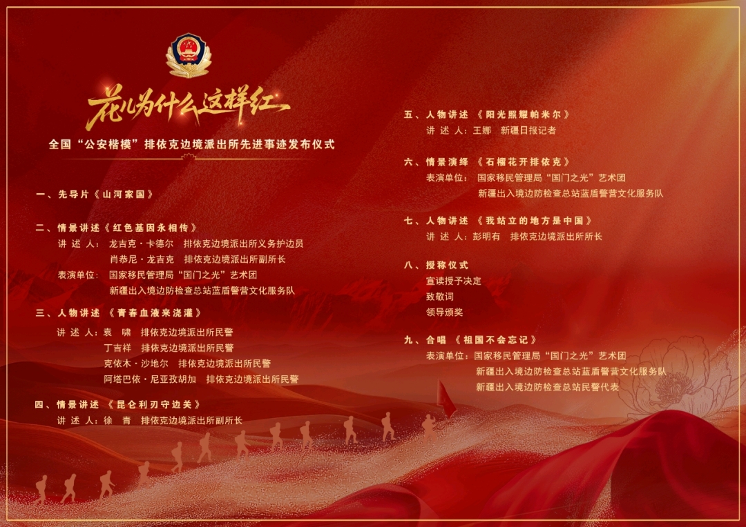 發(fā)布儀式專題節(jié)目《花兒為什么這樣紅》于9月28日10:00在公安部政府網(wǎng)站、“公安部”微信視頻號、“國家移民管理局”微信視頻號、全國公安新媒體矩陣、“學習強國”學習平臺、央視網(wǎng)、光明網(wǎng)、環(huán)球時報等平臺同步直播,并于當晚在中央廣播電視總臺社會與法頻道(CCTV-12)播出